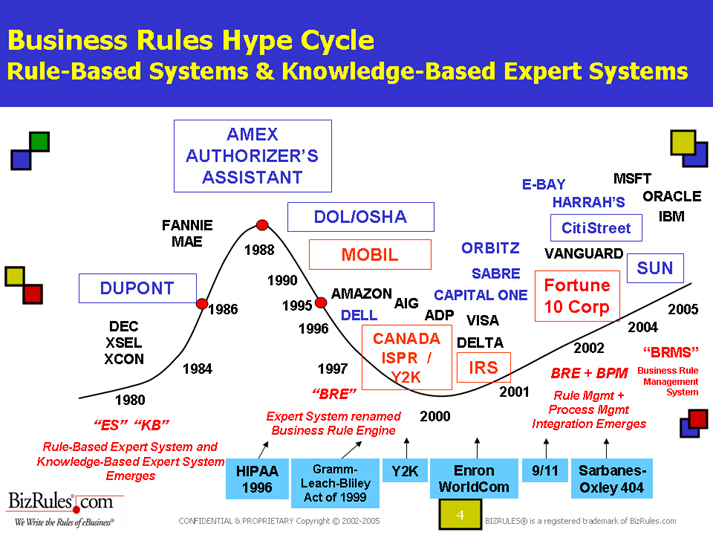 This diagram shows the ups and downs of the business rules market. Originally called expert systems and knowledge bases in the 1990s, this technology was renamed "Business Rule Engine" in the late 1990s. The current term "Business Rule Management System" emerged in 2004/2005. The companies in red boxes are BIZRULES case studies. See: