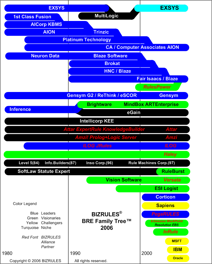 InRule, Versata, Pegasystems, Insession Technologies, Attar, and Amzi! Note: The companies/products in the BRE Family Tree™ also include: CA CleverPath AION, Gensym, MindBox Art Enterprise, Intellicorp, Haley, Rule Machines Corp., Exsys, SoftLaw, ESI Logist, Corticon,