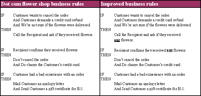 The whole point of CRM is building and managing individual relationships with customers, and personalizing interactions with customers. Just implementing a commercial off-the-shelf CRM package is not enough. You need to take advantage of its personalization features and incorporate your own business rules into the CRM package. That will make your CRM implementation unique. What if your competitors buy the same CRM package? Then your business rules become even more important - They differentiate you from the competition and give you a competitive edge. CRM personalization implementations work best when they use business rules and the business rules approach. Companies that focus on business rules when designing and implementing CRM systems lower their risk of failure. Bruce Kasanoff agrees. Bruce was a longtime partner at Peppers and Rogers Group, the group that created the one-to-one personalization movement. He is an expert in one-to-one and personalization and the author of "MAKING IT PERSONAL: How to Profit from Personalization without Invading Privacy." Bruce has talked with executives at leading CRM software companies and discovered that many CRM personalization implementations fail because business managers have never been trained to create or manage business rules. "CRM Software companies train you how to use their rule manager, but they don't teach you about business rules. They just teach you how to get their software working," Bruce said. A combination of business rules, collaborative filtering, and expert systems may be the best way to deliver successful CRM and personalization solutions. Collaborative filtering is the statistical correlation technique that Amazon uses to find visitors with similar patterns of behavior, and then uses their product selections as the basis for product recommendations. Expert systems can make expert recommendations and decisions using the same rules the experts use. They can also troubleshoot and diagnose complex problems. "Business rules are one of the technology approaches that's necessary for CRM personalization. I don't think that business rules by themselves are enough. You need other approaches and processes as well," said Bruce. Only 40% of CRM personalization implementations succeed today. Business rules could help improve that success rate. CRM Personalization is the killer app for business rulesRon Ross has said that personalization is the killer app for business rules. It's the first really groundbreaking application that really leverages and needs business rules. It's bringing business rules out of obscurity. And it's also bringing business rules out of IT and into the business management side. As business managers start working with business rules on CRM personalization projects, their awareness of the business rules approach will grow. As business managers realize that business rules can be automated, and once they understand that the business rules approach is faster, cheaper, and better than traditional development techniques, the business rules approach will become mainstream. Personalization business rules can get very complicated. "If I've got 10 different customer segments and I'm trying to figure out how to manage the interactions between each different segment, it gets hopelessly complex," said Bruce. You need a rule engine or a rulebase to manage all your rules, just like you need a database to manage all your data. You need a rule management system to test and verify new rules before they are implemented in production. You need controls to ensure that a new rule won't duplicate or conflict with a rule that somebody else wrote a few days ago. Writing good CRM personalization business rules is very challenging, and it requires both business knowledge and technical skills. Who writes the rules in your business?Just using business rules isn't enough to succeed at CRM personalization. You also need to make sure that your rules are correct and complete. You have to simplify your rules, and you need to design rules to attract and retain customers. Bad rules drive away good customers. Good rules attract and retain good customers. Recently my wife ordered flowers from a dot com flower shop for one of her employees who was in the hospital. The flowers never arrived. She called back and they promised to send them the next day. Next day, still no flowers. She gave up and called a local flower shop, which delivered the flowers within two hours. She called the dot com back to cancel the order. They transferred her a few times and gave her a few numbers to call. They promised they would not charge the $60 bill to her credit card, but they did anyway. We learned that one of their business rules is to call the recipient and ask if they got flowers. They actually called the employee and asked if she got flowers. She said yes, and they went ahead and charged the credit card. Had they taken the time to ask who delivered the flowers, they would have realized that another company had delivered these flowers, and they would not have lost this customer. A few weeks later they refunded the credit card and sent us a gift certificate for $11, along with a very nice apology letter.