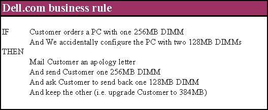 Bad rules drive away good customers. This rule was intended to cut fraud, but it was inadvertently designed to lose good customers instead. It doesn't work well at all - We won't buy anything else from this dot com. Now let's imagine that this company decides to implement a CRM personalization application to improve customer service. They decide to use business rules and collaborative filtering. They take their top customer service agents and decide to build expert systems for product selection and problem troubleshooting. Because the agents are experts at handling customer complaints, their rules on saving the customer are built into the CRM personalization system. If I ever call back to place a another order, their system will fire a rule that reminds them that I had a lot of trouble last time. That rule might recommend that they offer me a 50% discount for giving them a second chance, or it may even recommend that I get free flowers. It will be up to the business to make the rules to attract and retain customers. It will be up to the CRM personalization system to execute them. I had a much better experience with Dell.com and their CRM personalization rules. Their business rules are clearly designed to make the customer happy. A few months ago I went to Dell.com and bought a Dell laptop with 256MB of memory for a new project at a client site. I ordered one 256MB DIMM instead of two 128MB DIMMs in order to leave room for expansion. A few months later I got a letter from Dell telling me that during their normal quality control process they discovered that they had accidentally configured my PC with two 128MB DIMMs instead of one 256MB DIMM. They enclosed a 256MB DIMM and asked me to return just one of the 128MB DIMMs. They basically offered to upgrade my memory to 384MB in order to take care of a problem that I didn't even know I had! Dell understands that a customer could easily discover this mistake and have a good reason to be disappointed in Dell. They designed this rule to prevent that from happening.